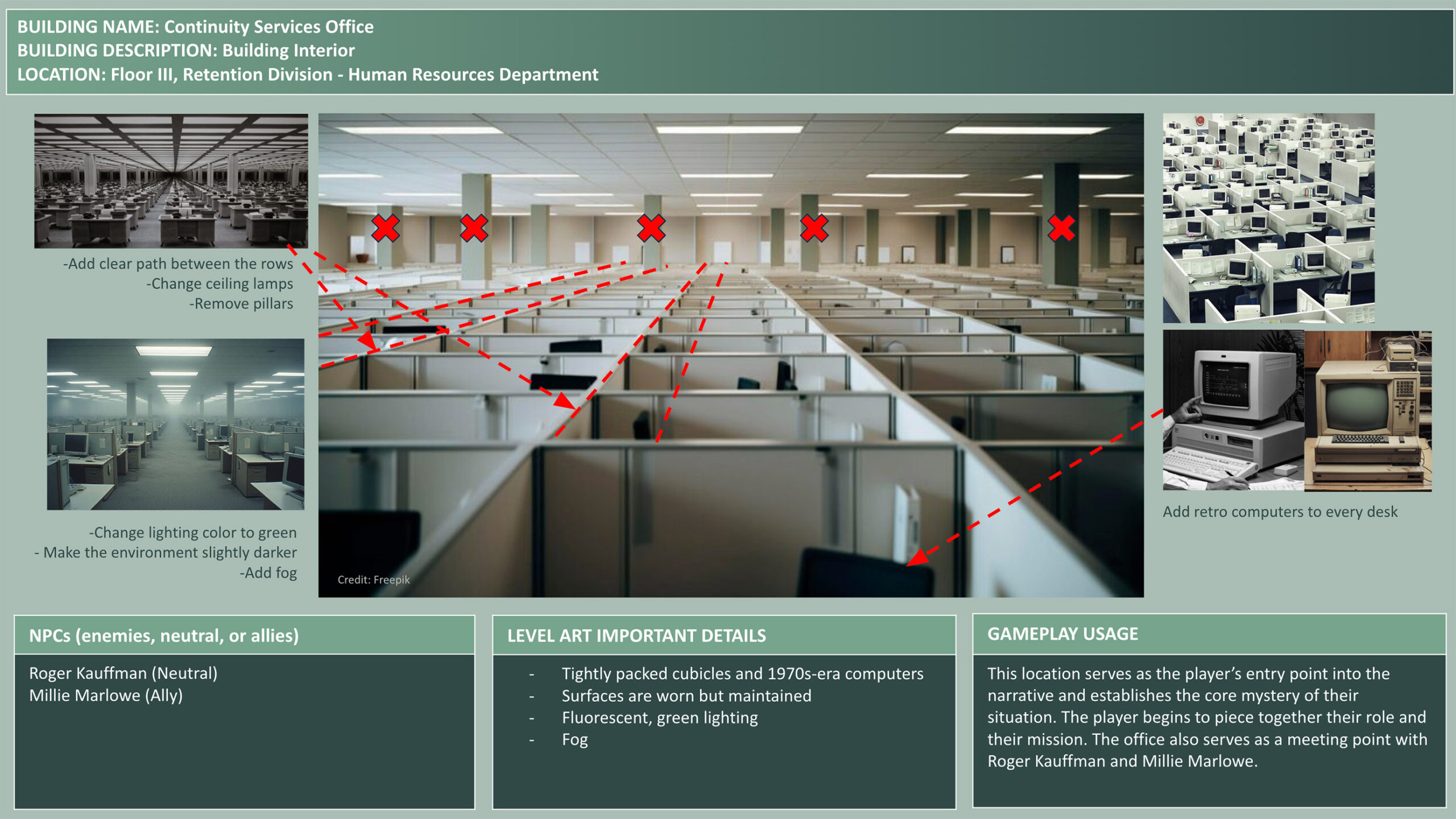 I designed the HR office as a functional workspace that clearly displays mundane bureaucracy but also hinting the true nature of the environment. The cubicle layout, desk placement, and retro computers were arranged to guide the Player movement, support NPC interactions, and create clear lines of sight for storytelling beats.