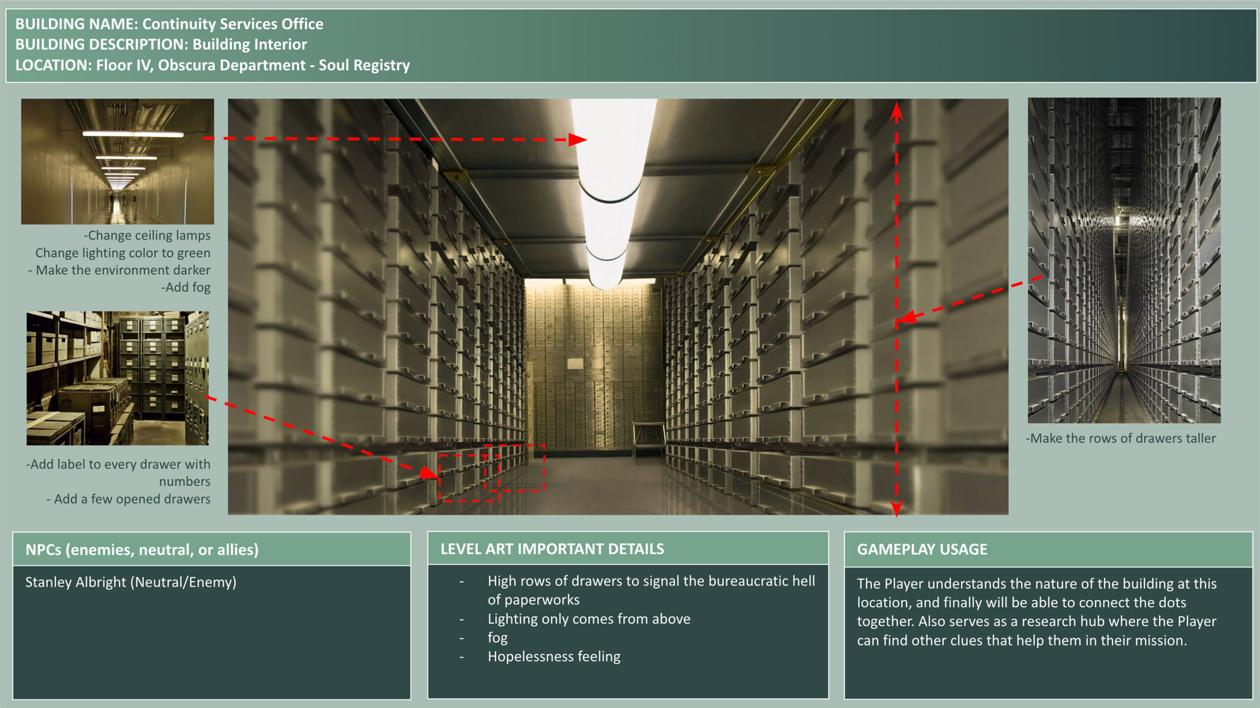 To design the Obscura Department that will appear in Chapter 2, I had three things in mind: a place that feels and signals hopelessness, bureaucratic hell and due to its weak lighting also should increase tension as one of the twist point happens here.