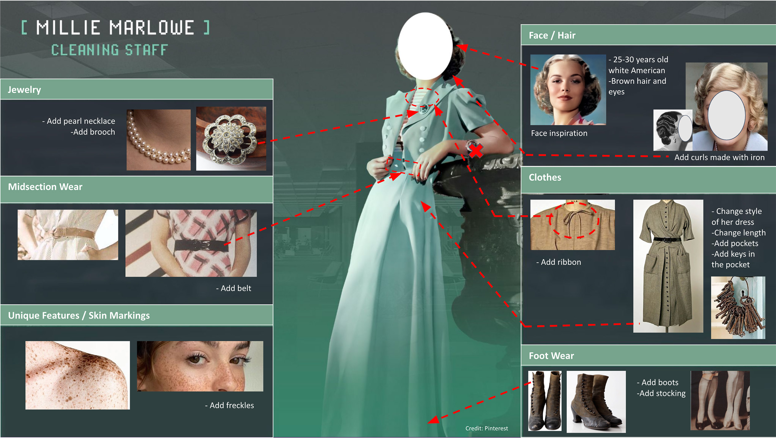 Millie Marlowe is a supporting NPC in the story, working as cleaning staff and source of information, helping for the Player to fill up the gaps regarding their memory loss. To design Millie, I focused on creating a character who slightly feels out-of-world and creates more questions than answers: a young, stylish woman who clearly hides more backstory that instantly gets the Player’s curiosity.