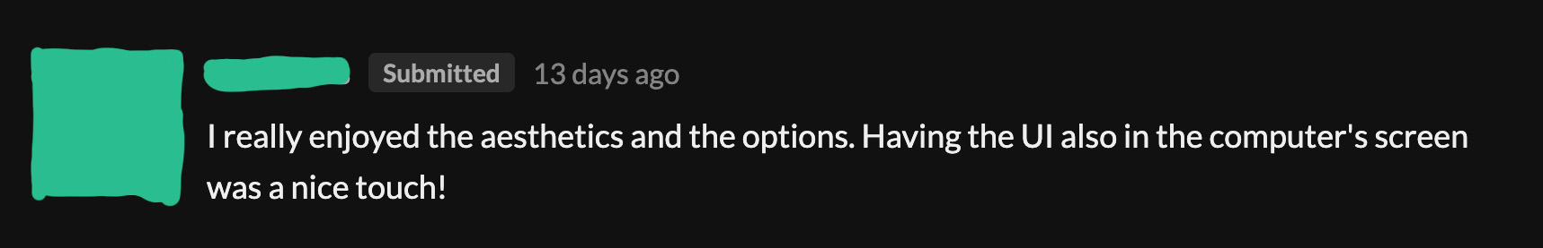 Optional characters, different endings, quests, more worldbuilding, more details, more juice. - Aesthetics: