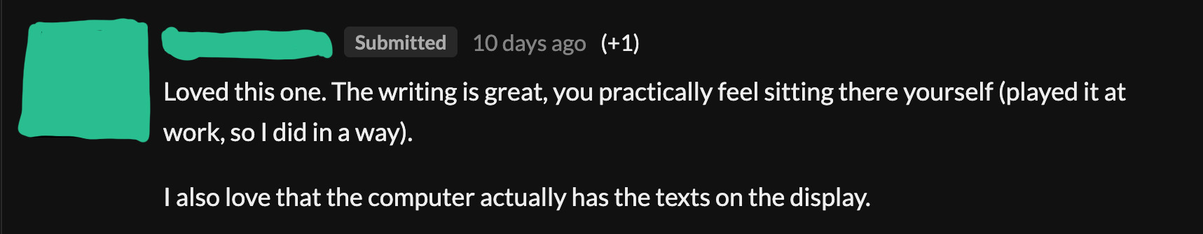 It was the first thing I wrote, right after I decided about the theme and setting of the story. Ideally, I like to write it on day one, so then I immediately see if the core loop is fun. Because if the first 30-60 seconds intro is boring, the rest of the game will be too.