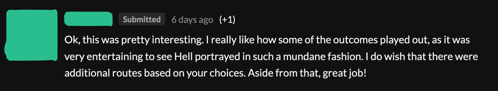When started writing ‘For Infernal Use Only’, I had a story outline in my mind that could be described as The Good Place in Black Mirror style with Severance’s dark dystopia – a bit of surreal setting with dark humor and twists. I researched similar games for a clearer view what kind of audience would be interested in my short story and to see what other games and stories deal with the concept I had in mind.