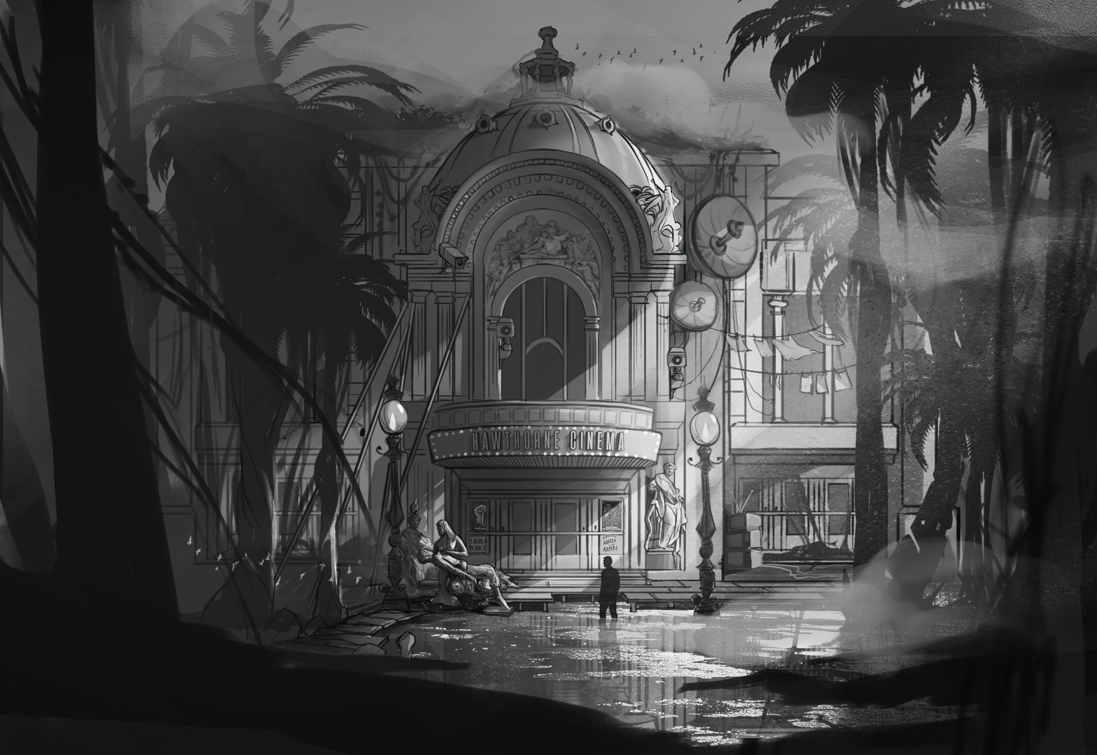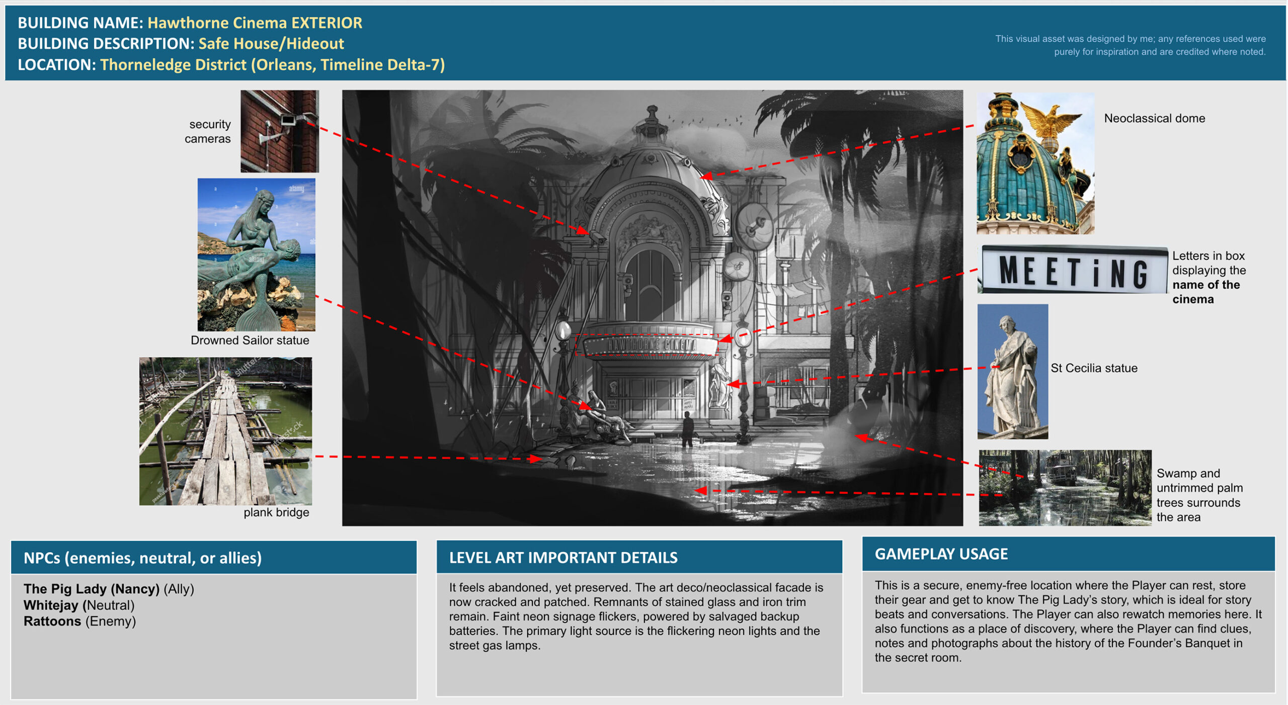 As a gameplay space, Hawthorne Cinema functions as a hide out place. Player can rest, store gear, and unlock deeper narrative threads through conversations with Pig Lady. Its projection system allows players to revisit memories and past decisions, either through personal devices or displayed on the massive screen.