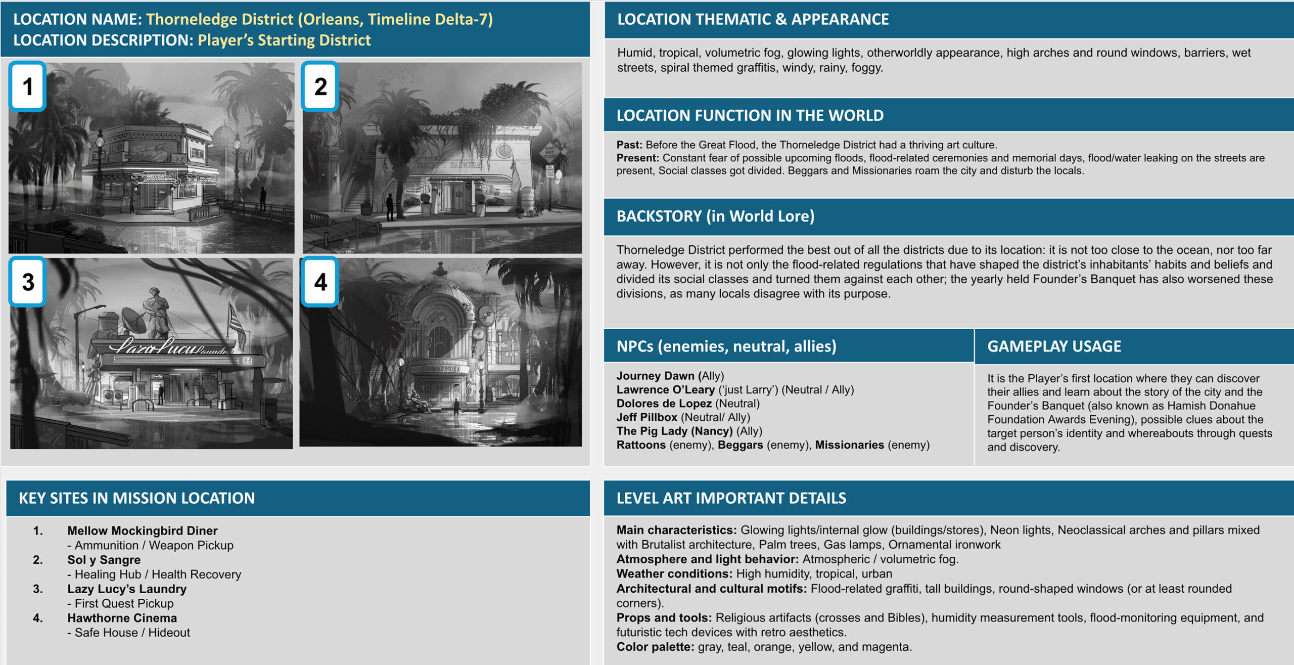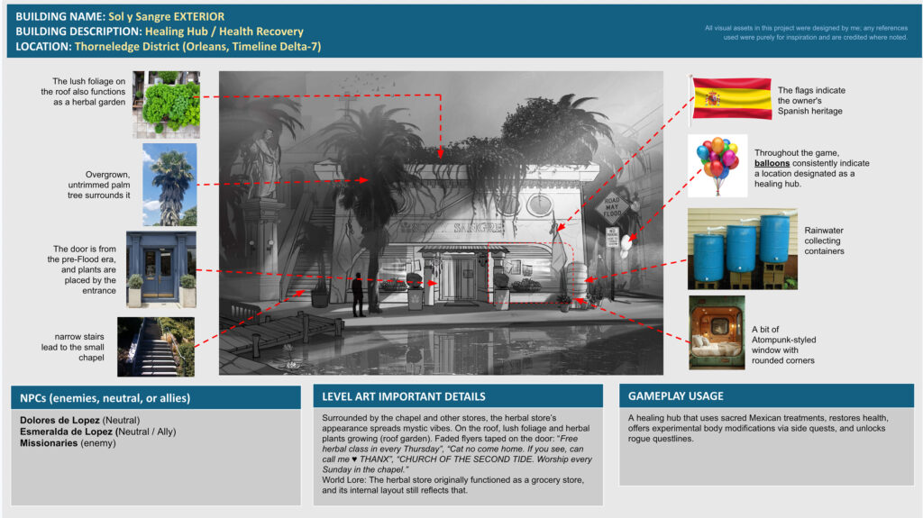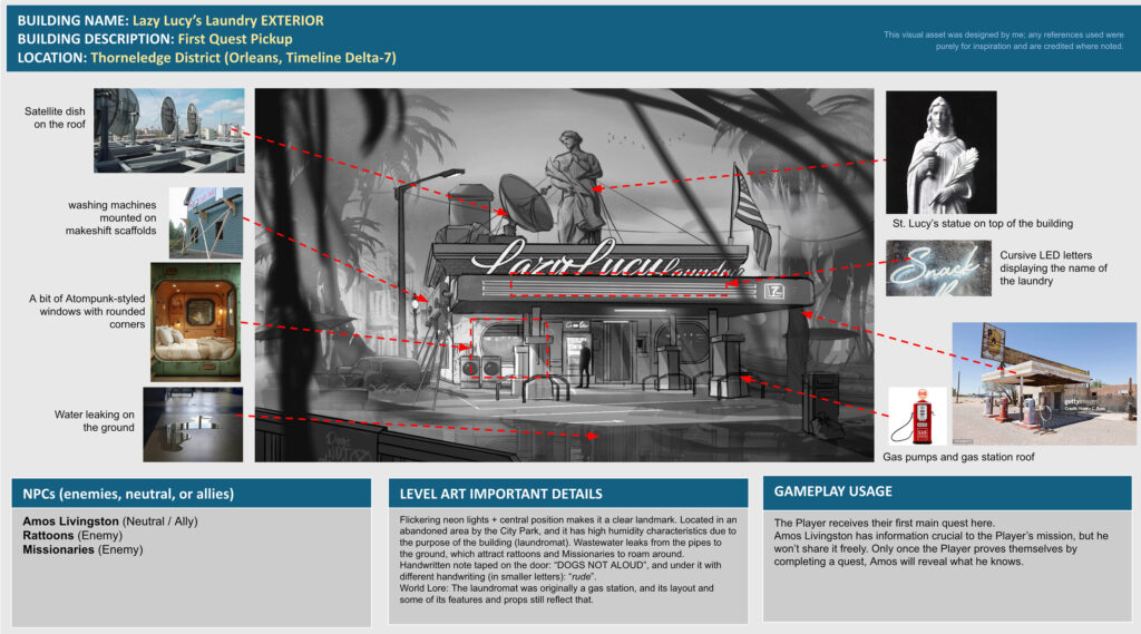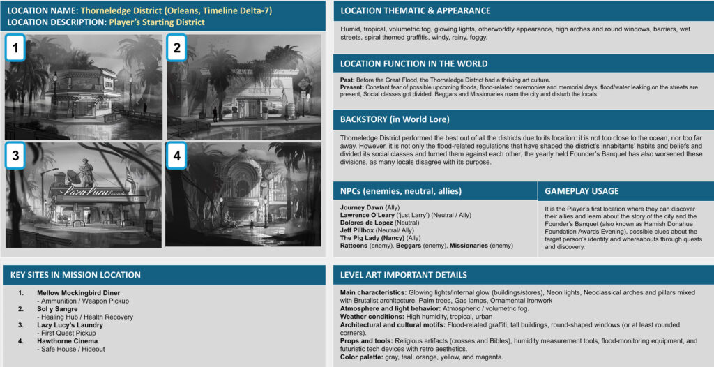 I designed Orleans and Orleans Falls to meet specific spatial and gameplay needs for a near-future sci-fi setting deeply shaped by flooding and class division.