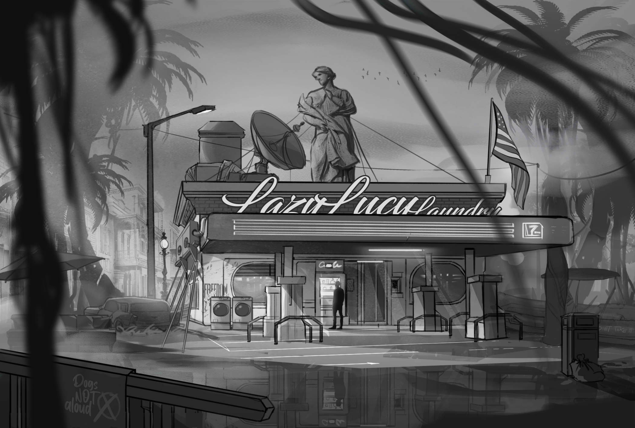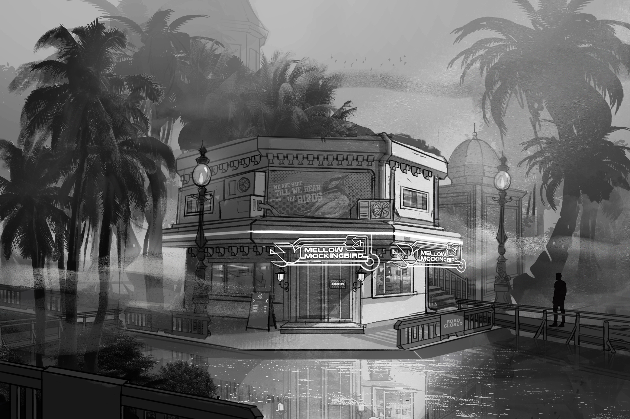 The Mellow Mockingbird serves as the player’s first contact with the underground resistance network. Though disguised as a retro diner, its hexagonal architecture hints at its true purpose: a covert surveillance hub monitoring citywide flood-response protocols and movement restrictions.