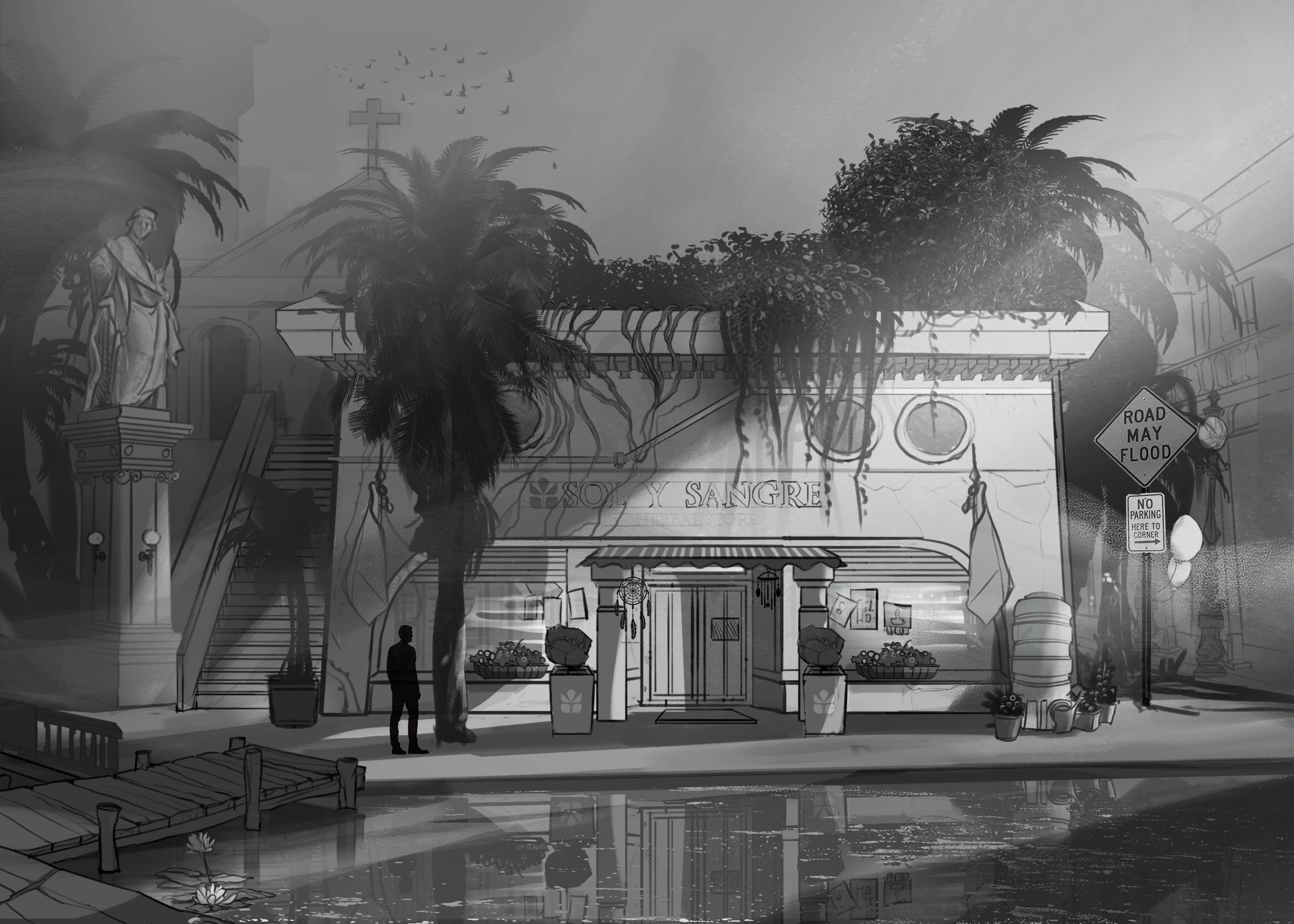 At first, Sol y Sangre appears to be a herbal shop, but it’s much more than that. Its amber windows glow through the fog like an oasis in a desert, hinting at the core themes of sunlight and blood, herbal medicine, and rebirth after decay.