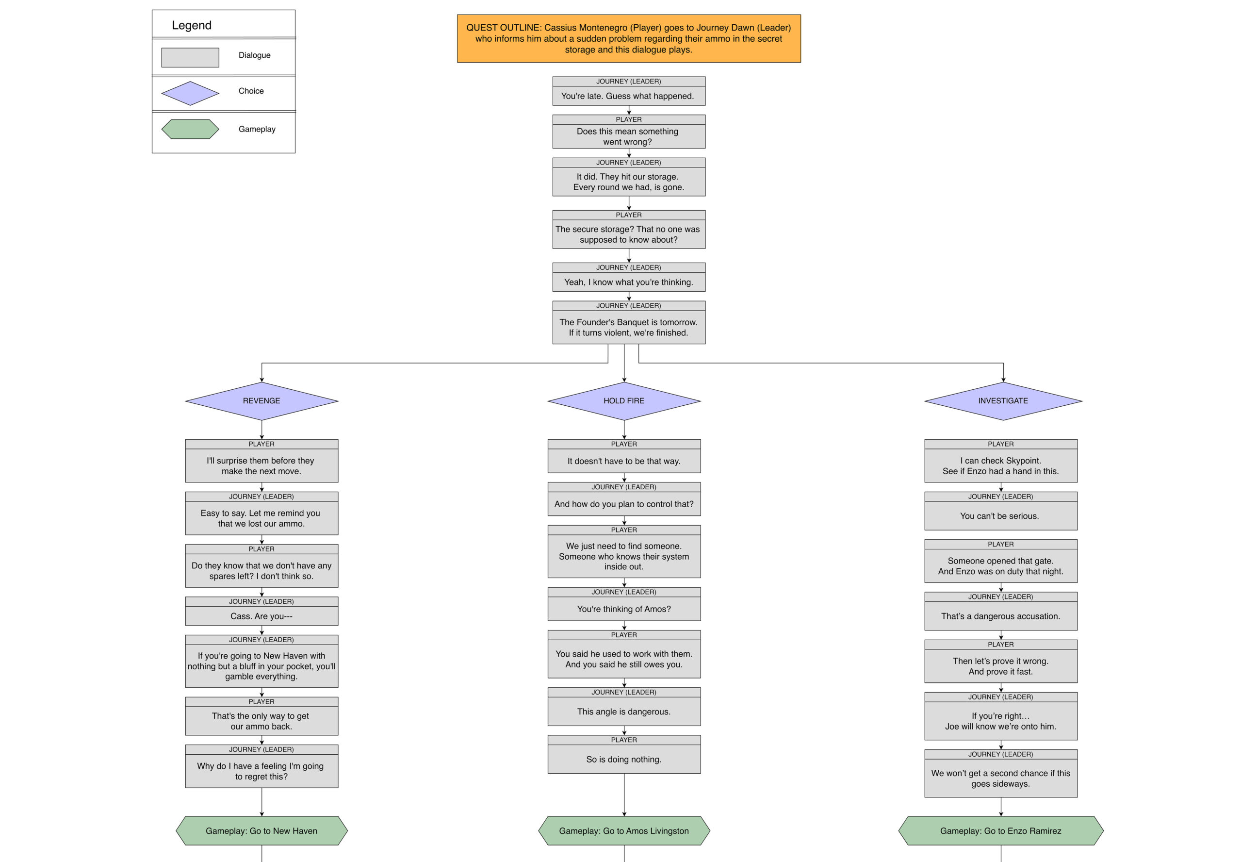 Designed a branching dialogue between the Player Character and the Leader, introducing mystery and establishing narrative agency early in the game.