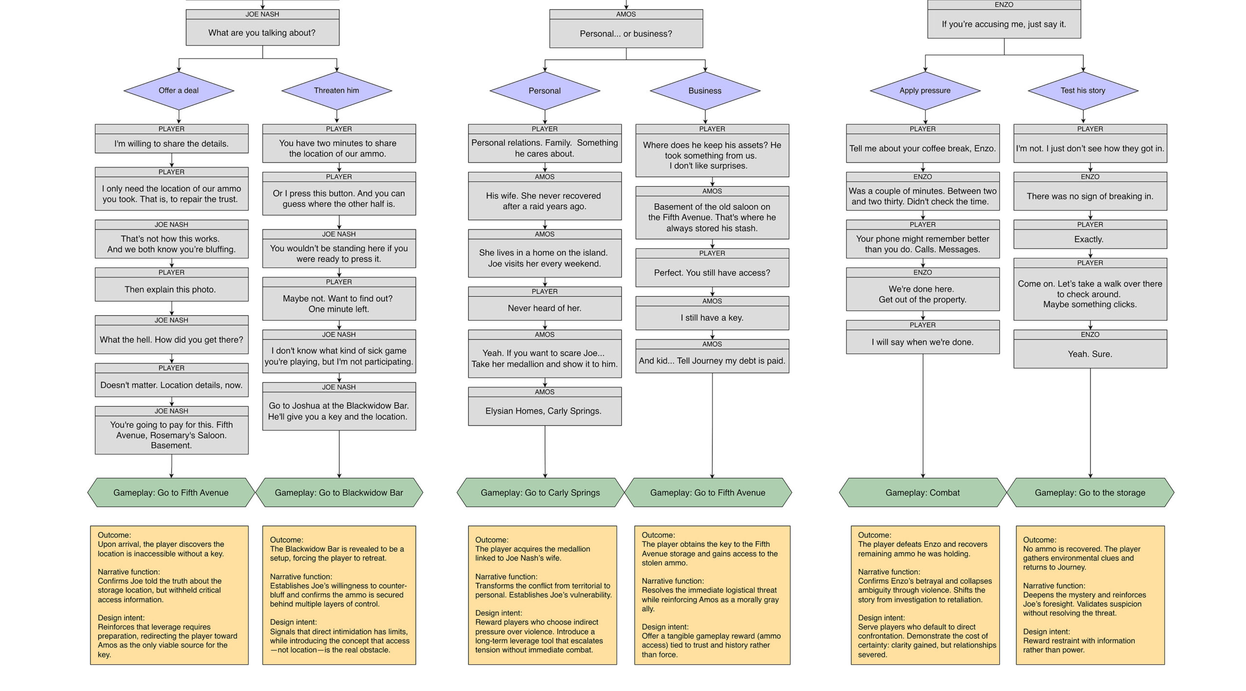 Present three distinct player stances through dialogue choices (revenge through bluff, hold fire, or investigation), each routing the player toward a different contact and location