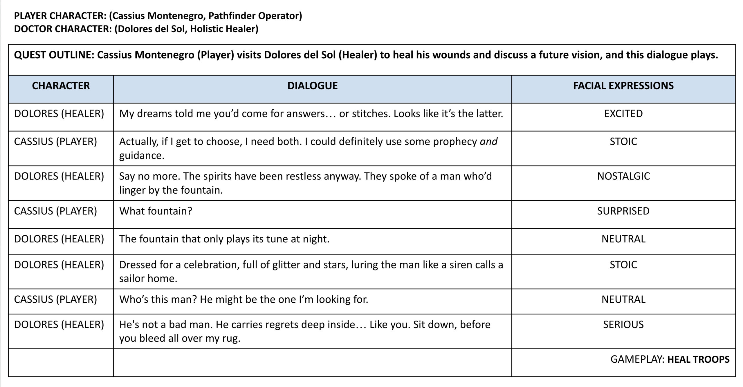 - Wrote dialogue and performance notes that reveal different layers of caution or vulnerability depending on the player’s loyalty choices and relationship history with her.