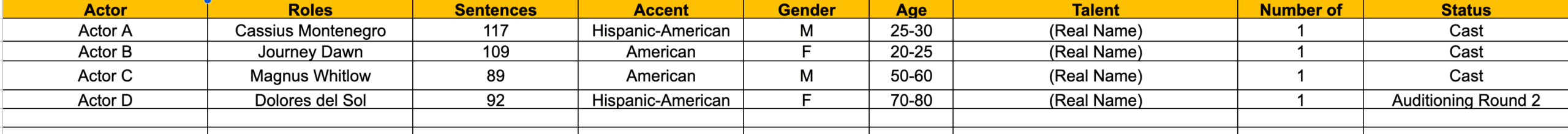 - Maintained clear organization through a master script and role-specific casting sheets.